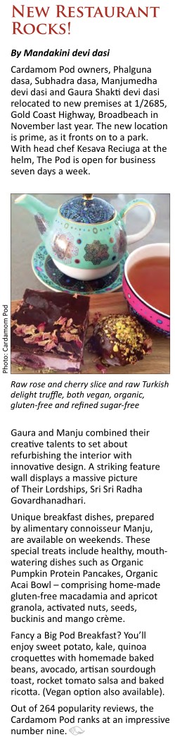 “Cardamom Pod” owners, Phalguna dasa, Subhadra dasa, Manjumedha devi dasi and Gaura Shakti devi dasi relocated to new premises at 1/2685, Gold Coast Highway, Broadbeach in November last year. The new location is prime, as it fronts on to a park. With head chef Kesava Reciuga at the helm, The Pod is open for business seven days a week.