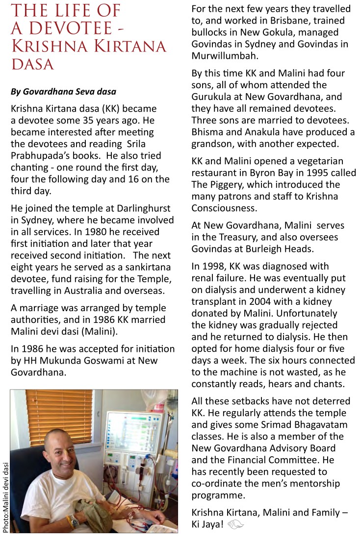 In 1998, KK was diagnosed with renal failure. He was eventually put on dialysis and underwent a kidney transplant in 2004 with a kidney donated by Malini. Unfortunately the kidney was gradually rejected and he returned to dialysis. He then opted for home dialysis four or five days a week. The six hours connected to the machine is not wasted, as he constantly reads, hears and chants. All these setbacks have not deterred KK. He regularly attends the temple and gives some Srimad Bhagavatam classes. He is also a member of the New Govardhana Advisory Board and the Financial Committee. He has recently been requested to co-ordinate the men’s mentorship programme. Krishna Kirtana, Malini and Family – Ki Jaya!