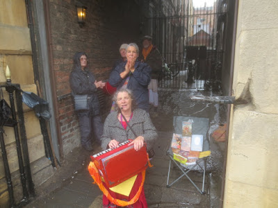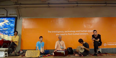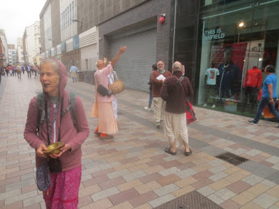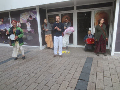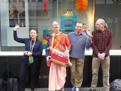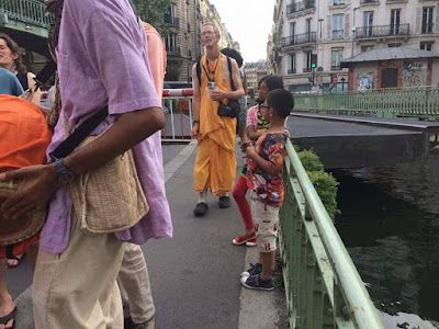 Here Vicaru Prabhu chants Hare Krishna outside Printemps, a massive high-end shop in Paris, on a very rainy Thursday. Refugee kids dance and otherwise interact with devotees (https://youtu.be/qb1OU-rdgdo):