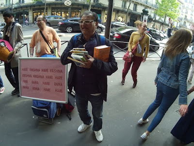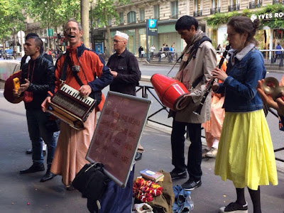 A lively group of Paris devotees chants Hare Krishna with enthusiasm every Saturday for two or three hours, this time outside Printemps. Passersby often take photos and/or dance, and a few brave souls accept spiritual food and literature (https://youtu.be/xaBcr1V8bCk):