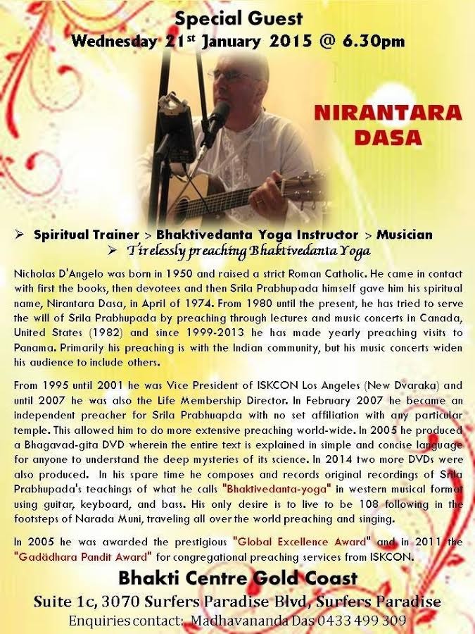 Nirantara Dasa in concert at the Bhakti Centre Gold Coast Australia, this Wednesday, 21st January, 2015